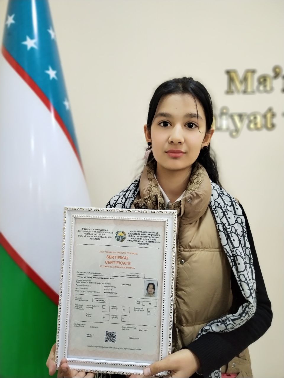 O'zbekiston-Finlandiya pedagogika institutining akademik litseyi 1-kurs o'quvchisi Jahongirova Maftuna Shodmonovna Chet tilini bilish darajasi to'g'risida sertifikatni qo'lga kiritdi.